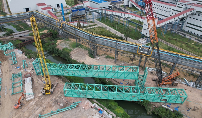 马钢新特钢项目跨河通廊吊装完成
