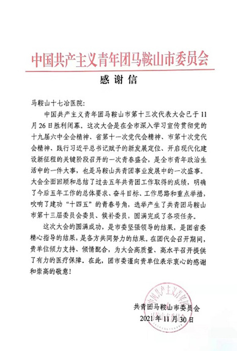 11月30日,共青团马鞍山市委向马鞍山十七冶医院发来感谢信,对在中国共产主义青年团马鞍山市第十三次代表大会期间提供的医疗保障工作表示感谢。
