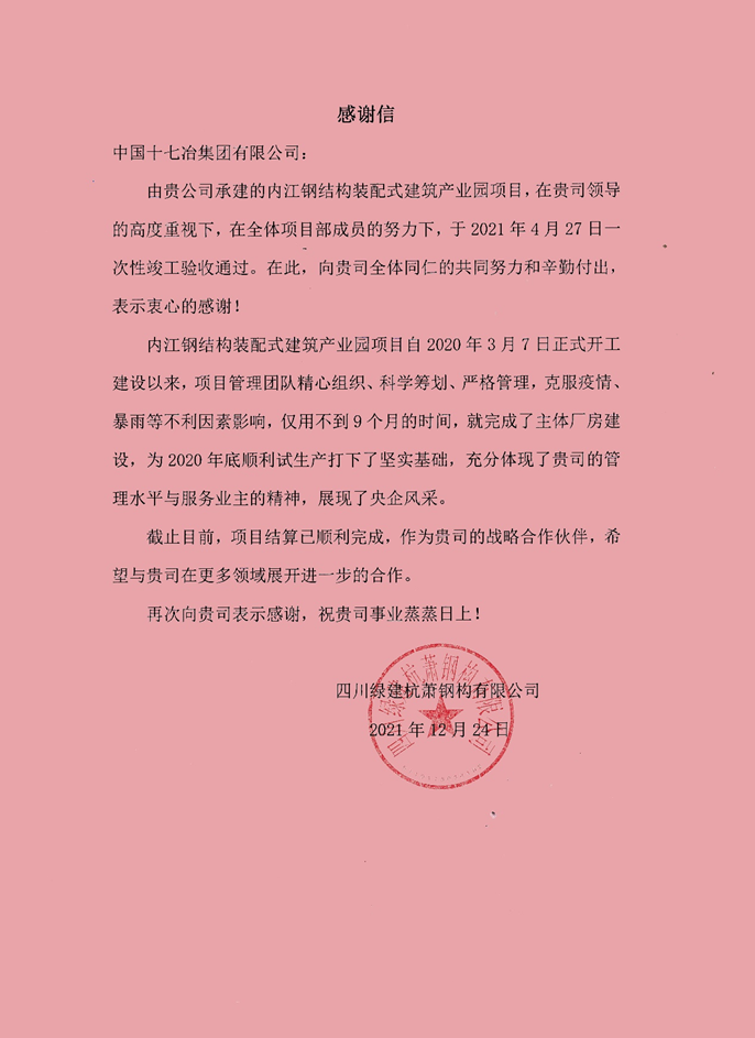 12月31日, 四川绿建杭萧钢构有限公司向中国十七冶集团致感谢信,对内江钢结构装配式建筑产业园项目团队一年多来的辛勤付出表示感谢。