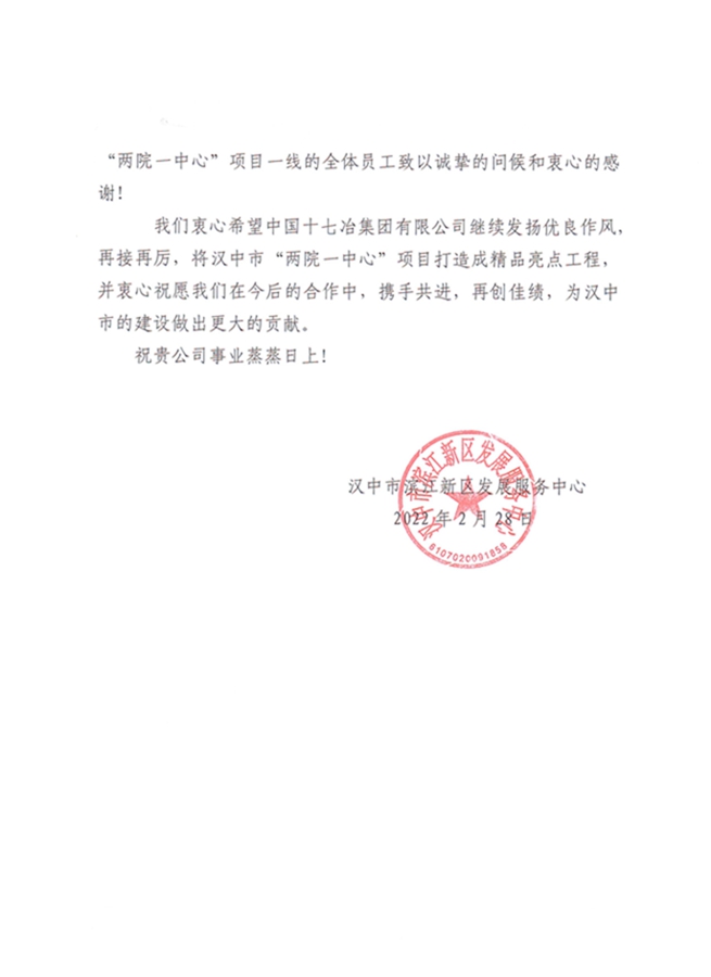 近日,汉中市滨江新区发展服务中心向中国十七冶集团发来表扬信,对公司承建的汉中市“两院一中心”项目全体员工在春节期间放弃与家人团聚的宝贵时光,主动投身项目建设给予充分肯定和高度赞扬。