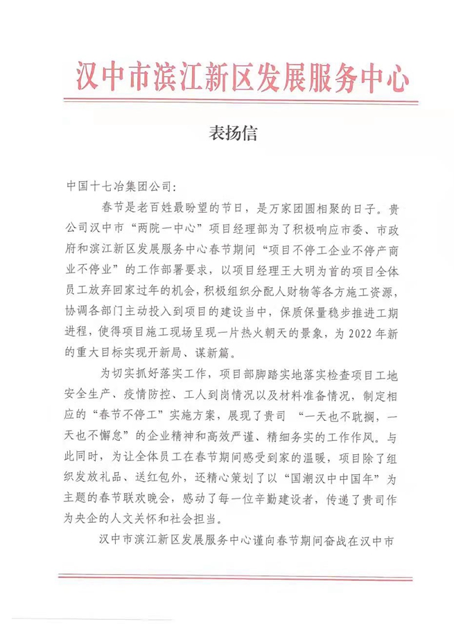 汉中市滨江新区发展服务中心向十七冶致表扬信