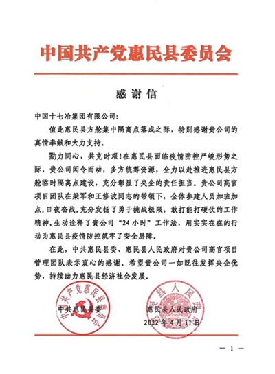 4月25日,滨州市惠民县委县政府向十七冶致感谢信,感谢十七冶集团在惠民县疫情防控中的真情奉献和大力支持。