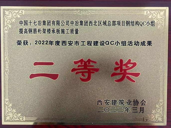 6月6日,西安建筑业协会公布了2022年度西安市工程建设QC小组活动成果,中国十七冶集团陕西分公司中冶集团西北区域总部项目钢结构QC小组“提高钢筋桁架楼承板施工质量”荣获二等奖,“提高钢结构预埋件预埋准确率”“BIM QC小组运用BIM技术提高钢结构连廊吊装成功率”获三等奖,西安交通大学第一附属医院国际陆港医院项目部QC小组“提高钢筋直螺纹的施工质量”获西安市工程建设QC小组活动成果三等奖。