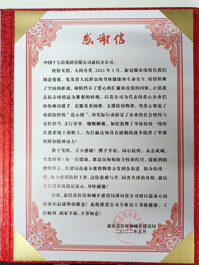 6月13日,山东滨州市惠民县住房和城乡建设局向中国十七冶集团致感谢信,同时因在惠民县住建系统抗击新冠肺炎疫情工作中表现突出,授予十七冶惠民分公司“突出贡献企业”称号。