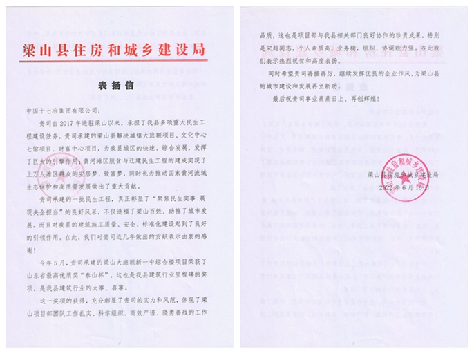 6月16日,山东梁山县住房和城乡建设局向中国十七冶集团致表扬信,对山东分公司承建的梁山县多项重大民生工程给予了充分肯定,并高度表扬了项目管理团队。