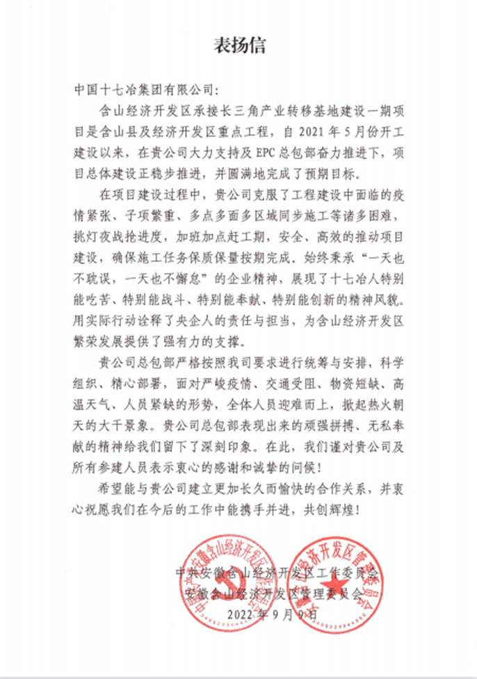 表扬信中指出,自开工建设以来,项目部严格按照业主单位要求进行统筹与安排,科学组织、精心部署,积极克服新冠疫情带来的交通受阻和物资短缺、子项繁多、多点多面多区域同步施工、高温天气以及人员紧缺等不利因素,迎难而上、挑灯夜战、加班加点,全力以赴、安全高效推动项目建设,展现了特别能吃苦、特别能战斗、特别能奉献、特别能创新的精神风貌,用实际行动为含山经济开发区繁荣发展提供了强有力的支撑。希望与十七冶建立长久愉快的合作关系,携手并进、共创辉煌。