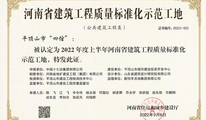 近日,河南省住房和城乡建设厅正式发布《关于公布2022年度上半年河南省建筑工程质量标准化示范工地的通知》,中国十七冶承建的平顶山市“四馆”工程荣获“河南省建筑工程质量标准化示范工地”称号。