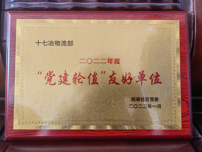 1月13日,十七冶达成分公司物流部党支部被雨山区平湖街道明渠社区党委评为“2022年度党建轮值”友好单位。