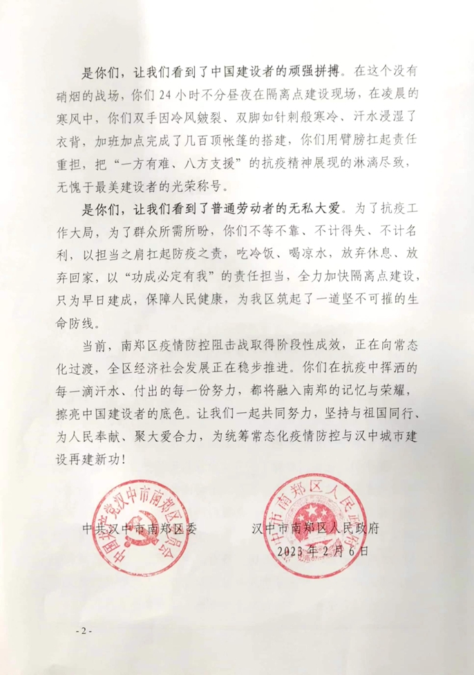 近日,汉中市南郑区委、区人民政府向中国十七冶集团致感谢信,对陕西分公司汉中市“两院一中心”项目团队在2022年南郑区疫情“阻击战”中的艰苦付出给予充分肯定并致以衷心感谢。