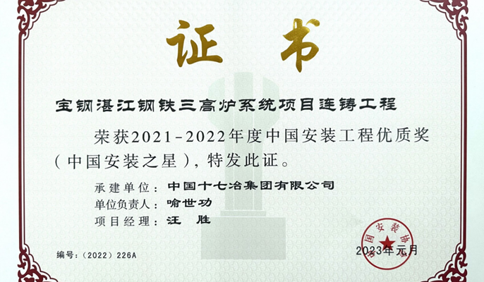 日前,在中国安装协会第七届四次理事(扩大)会议暨第七届四次常务理事会上,中国十七冶冶金分公司承建的宝钢广东湛江钢铁三高炉系统项目连铸工程荣获“2021-2022年度中国安装工程优质奖(中国安装之星)”,充分彰显了十七冶在机电安装领域专业实力,树立了优质品牌形象。