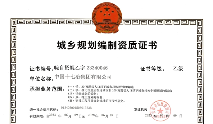6月9日,经安徽省自然资源厅核准,中国十七冶集团顺利通过审查认定,获批城乡规划编制乙级资质。标志着公司业务不断向工程建设的上游产业链延伸,向成为工程建设全产业链EPC总承包商又迈出了坚实的一步。