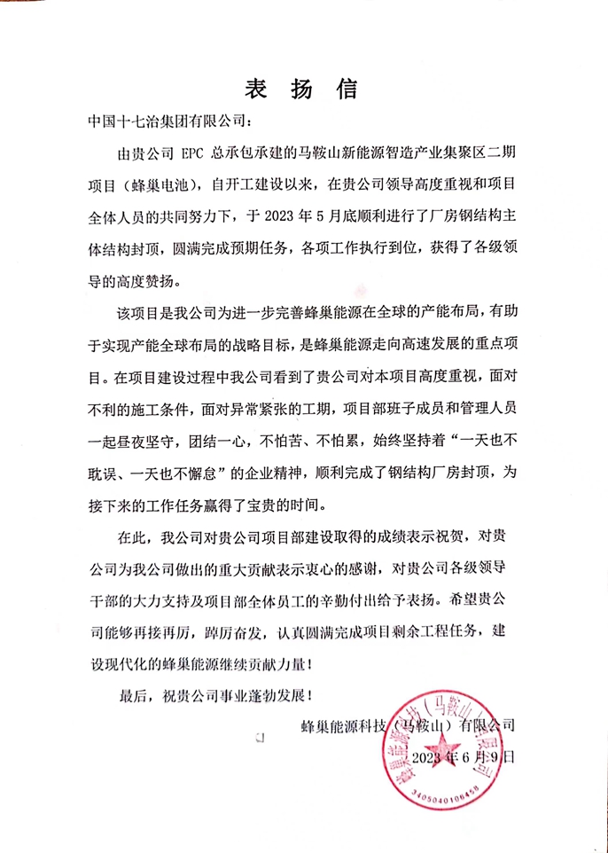 近日,蜂巢能源科技(马鞍山)有限公司向中国十七冶集团致表扬信,对房屋分公司蜂巢项目团队精心组织,于5月底圆满完成项目厂房钢结构主体封顶目标表示高度赞扬。