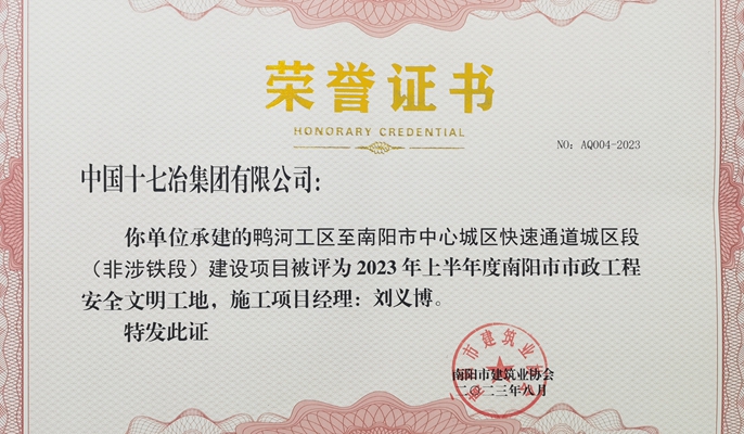 8月20日,从南阳市建筑业协会获悉,中国十七冶路桥分公司承建的鸭河工区至南阳市中心城区快速通道城区段(非涉铁段)项目荣获“2023年上半年度南阳市市政工程安全文明工地”称号。